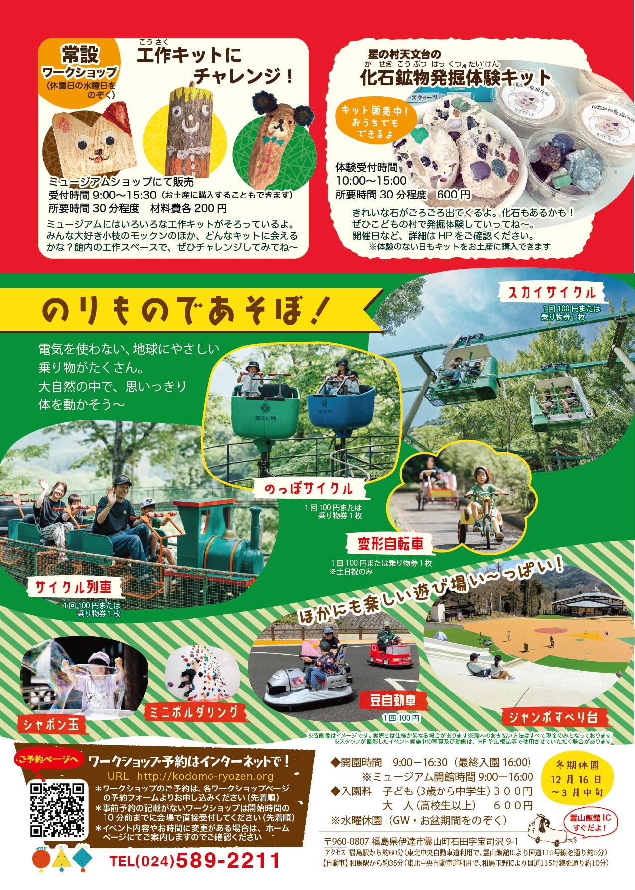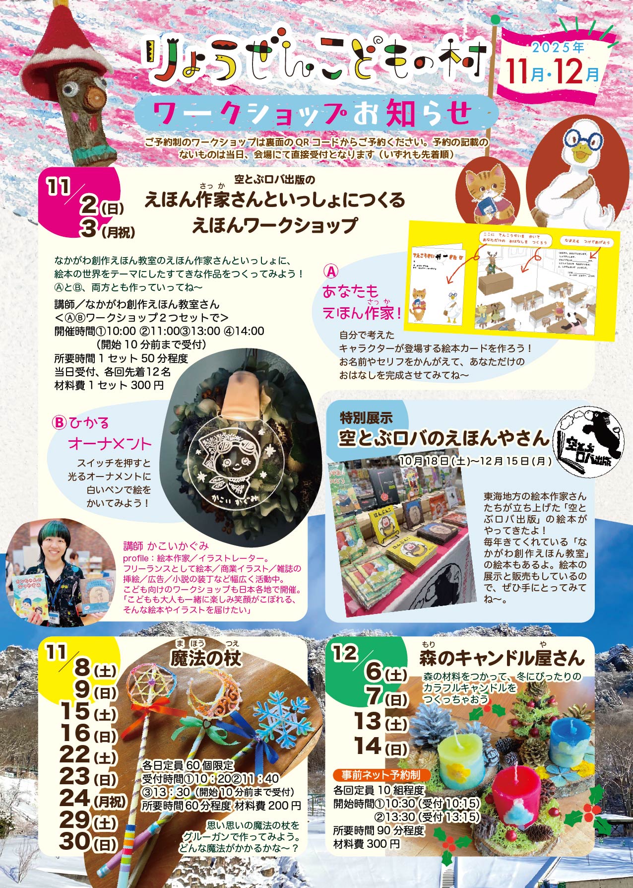 2025年11月・12月のこどもの村チラシ及び、有料遊具など各種お知らせです。ワークショップやイベントについてぜひご一覧ください。